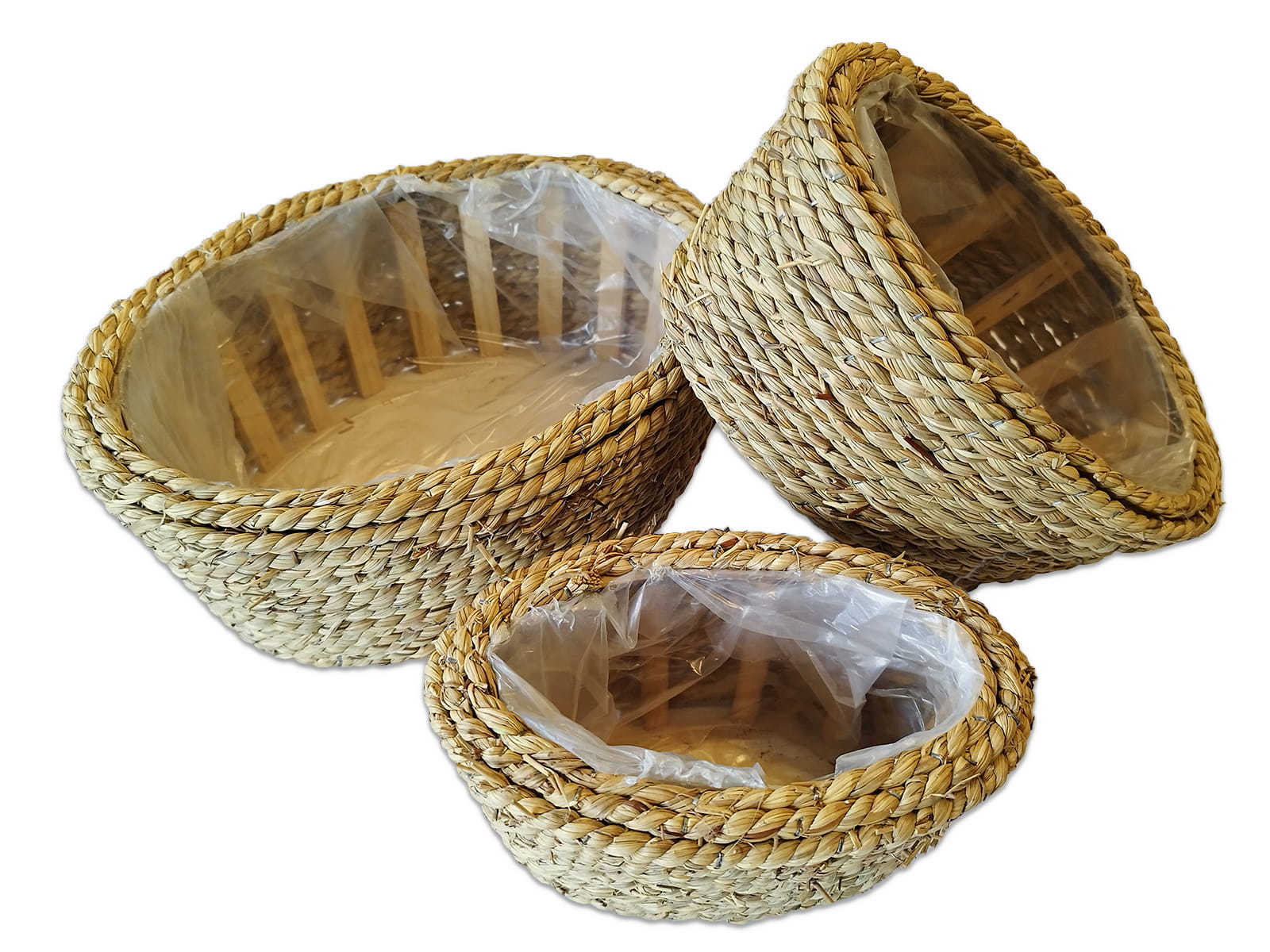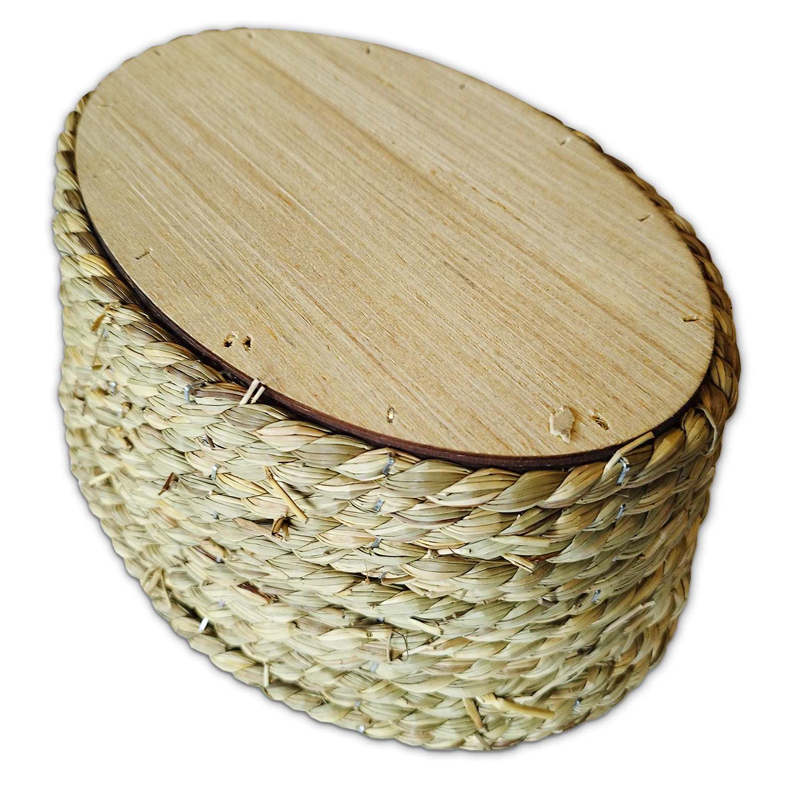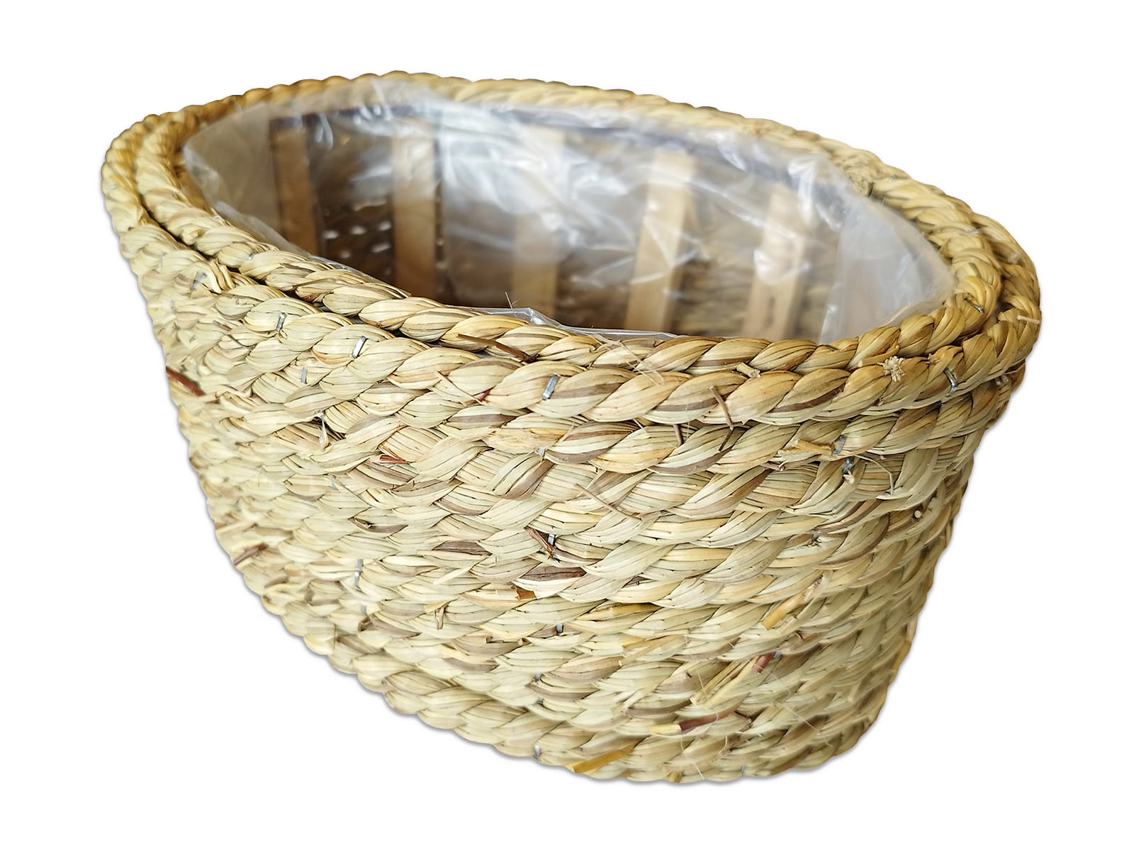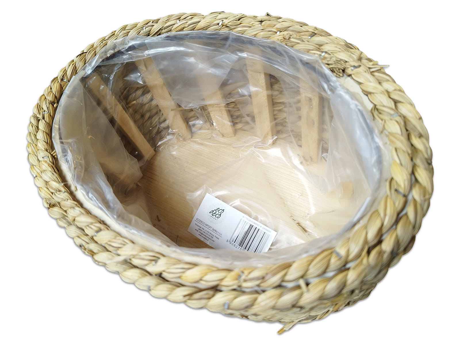 Osłonka owalna Boho 27 x 19 cm wykonana z drewna i trawy naturalnej wewnątrz zabezpieczona folią.