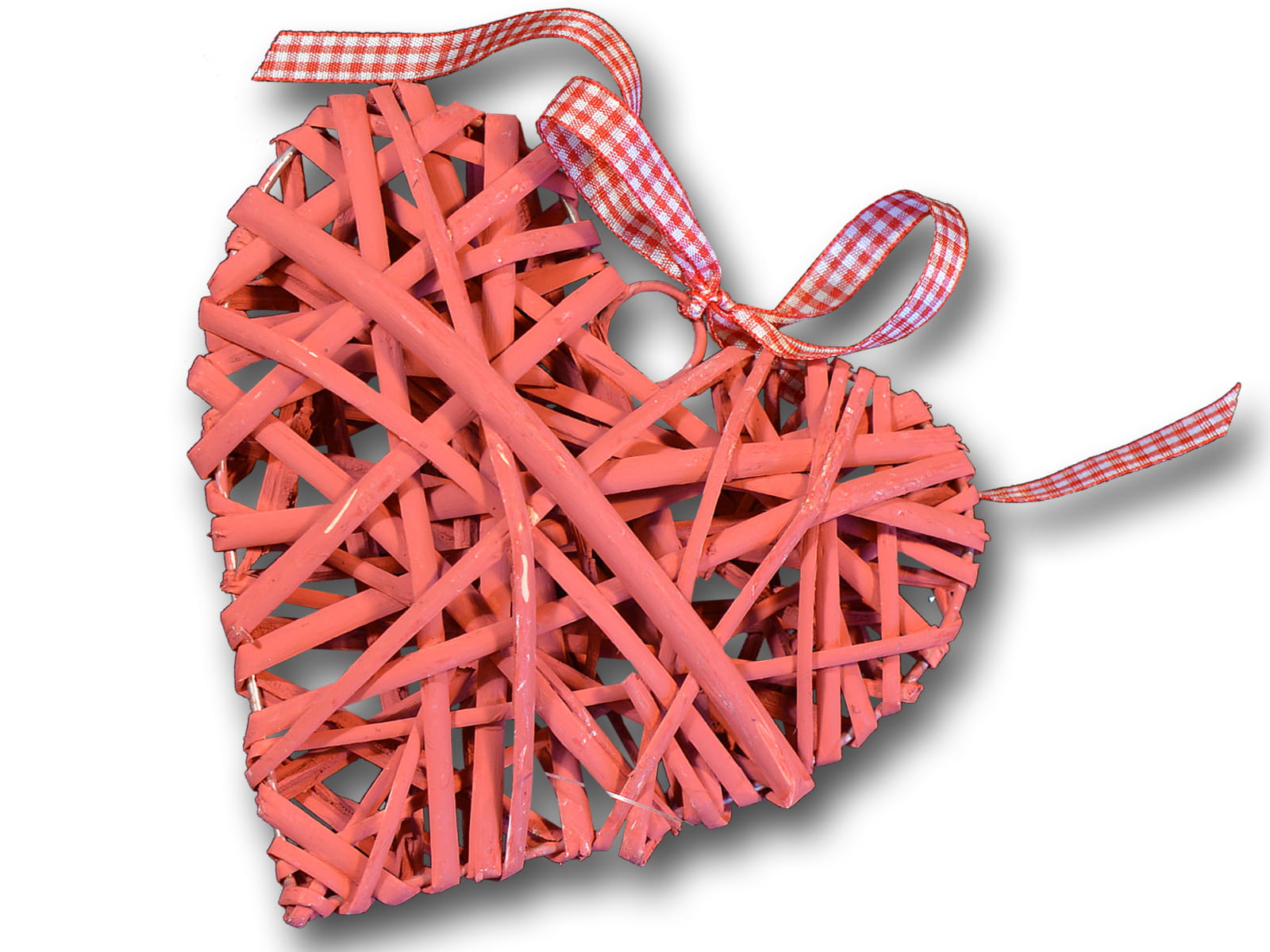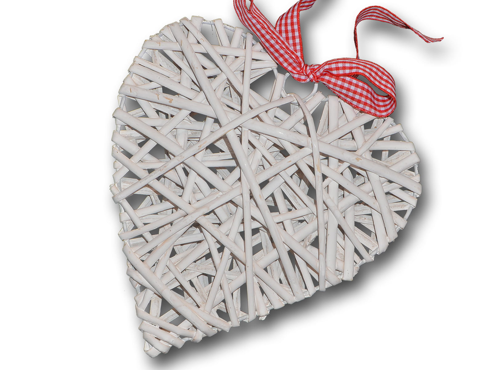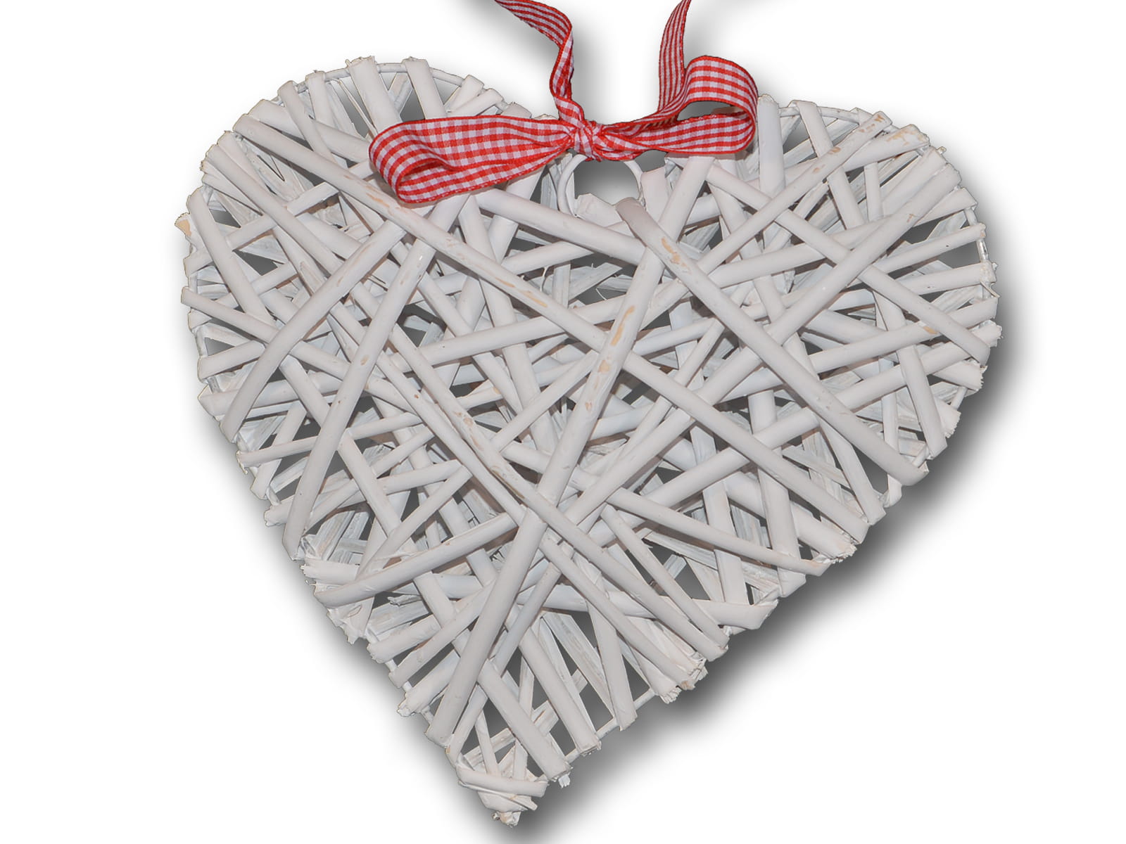na metalowym stelażu z wstążką w biało czerwoną kratkę zawiązaną na kokardkę, metalowe kółko umożliwiające zawieszenie - powieszenie serca w formie dekoracji.